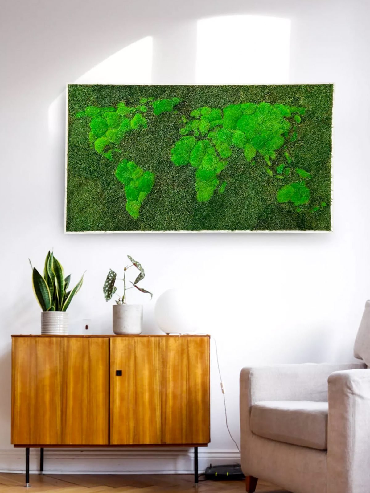 Bring a touch of nature into your home. As much as we adore the timeless beauty of wood, our love for design doesn’t stop here. This one-of-a-kind Moss World Map is crafted from natural ball and forest moss, creating a beautiful connection between your interior and the outdoors. Add a hint of greenery to your room or office, and you’ll feel as if you’re surrounded by a lush moss forest every time you glance at your wall. This statement piece transforms any interior and is sure to impress even the most discerning admirers.