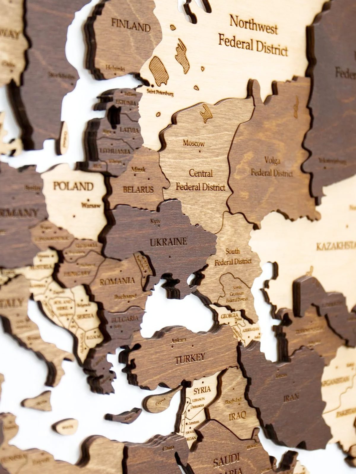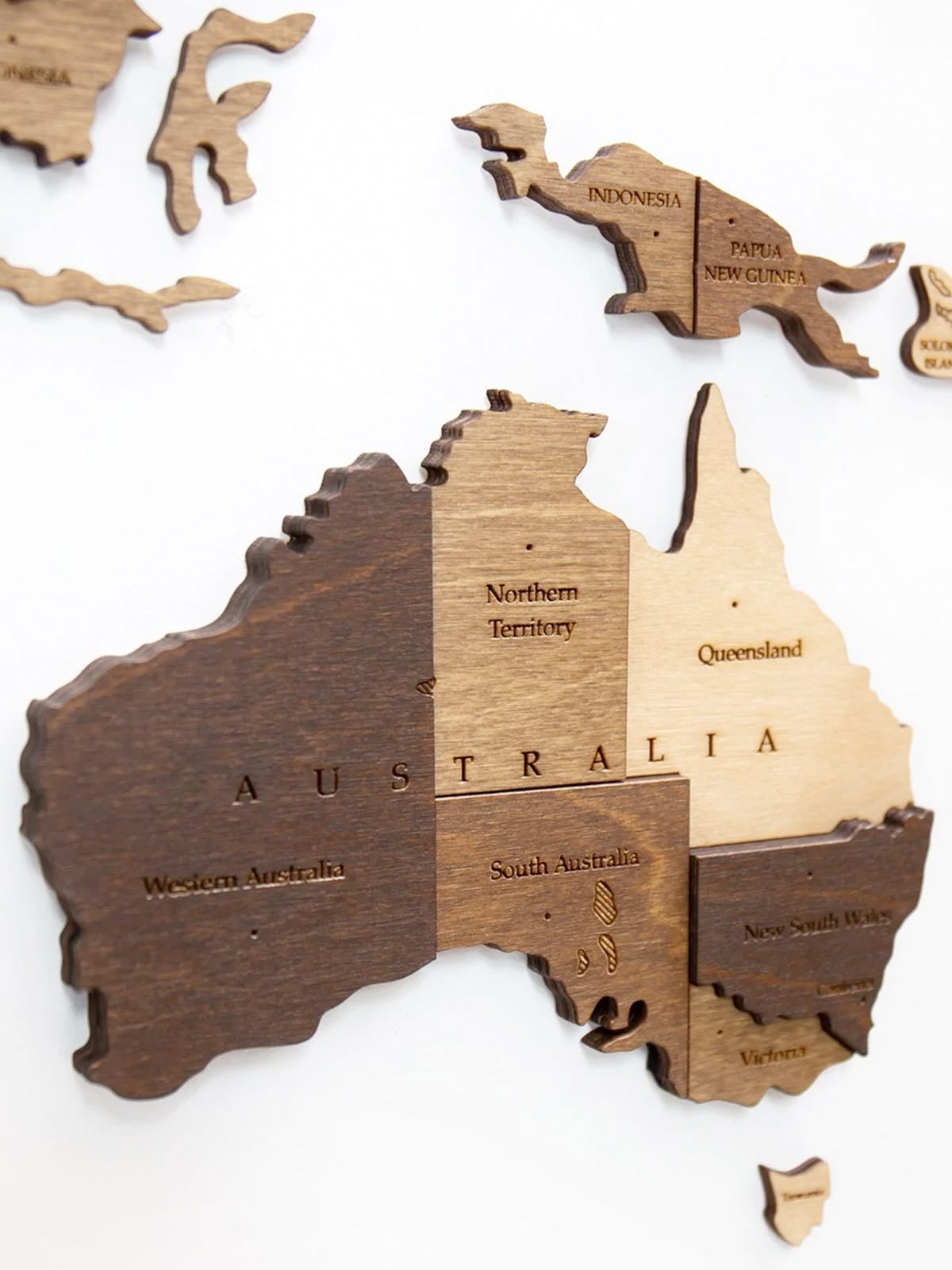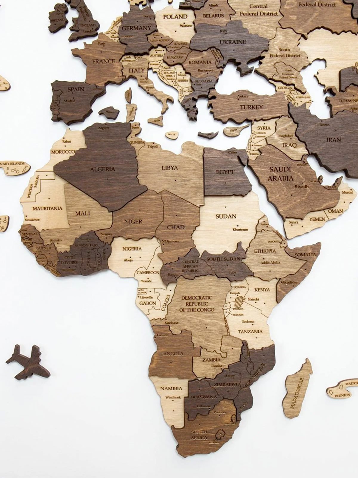 This luxury world map, with Antarctica included, is fully custom-made and crafted from natural wood (6 mm to 18 mm thick!). Our wooden world maps are available in different sizes and finishes — always of the highest quality. Every map also includes a step-by-step manual, corner stencils, removable mounting tape, and all the wooden accessories like ocean names, airplanes and a compass. Plus, we offer free home delivery.