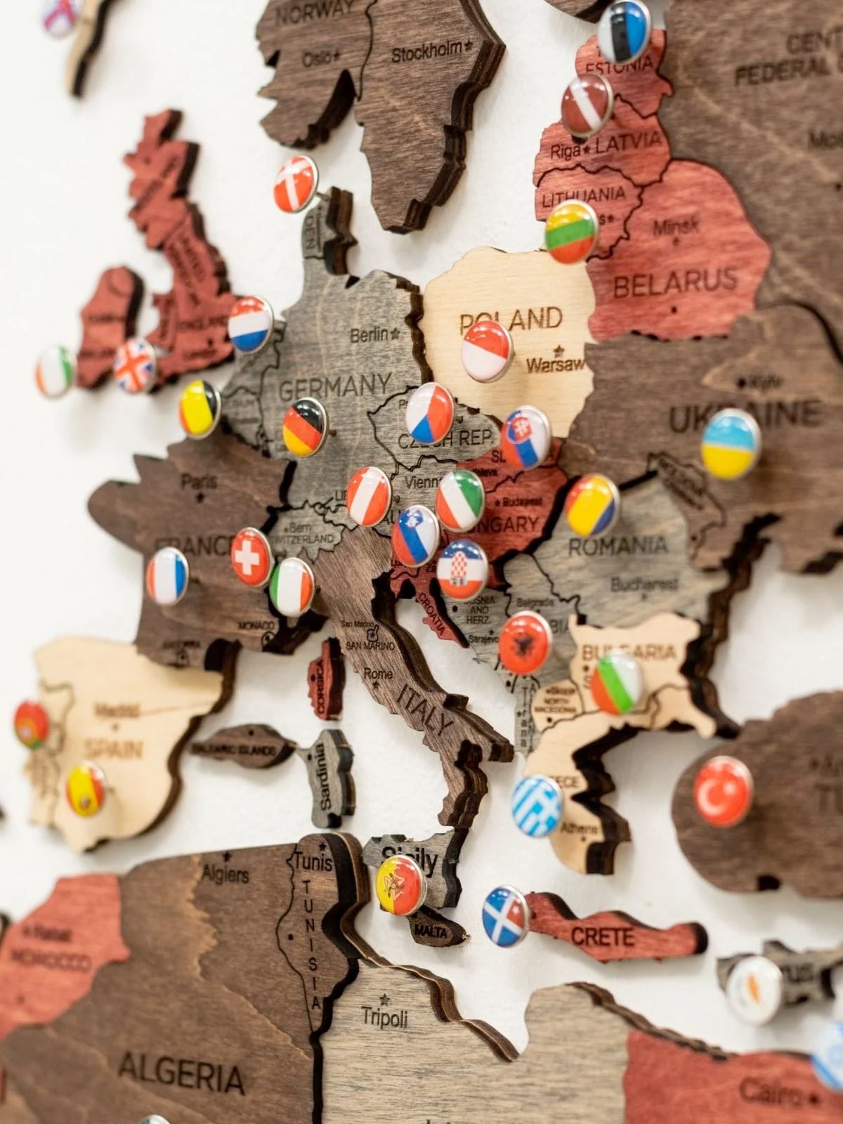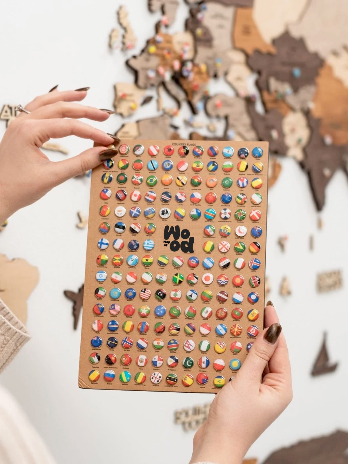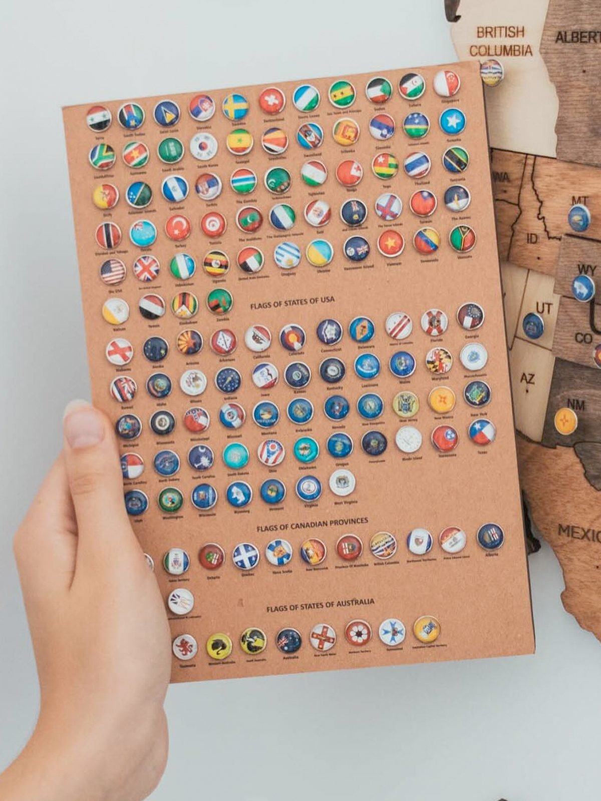 Bring your wooden world map to life with this complete set of 287 country flag push pins. Each pin features the national flag of a recognized country, allowing you to track your travels, highlight dream destinations, or showcase global connections with precision and flair.