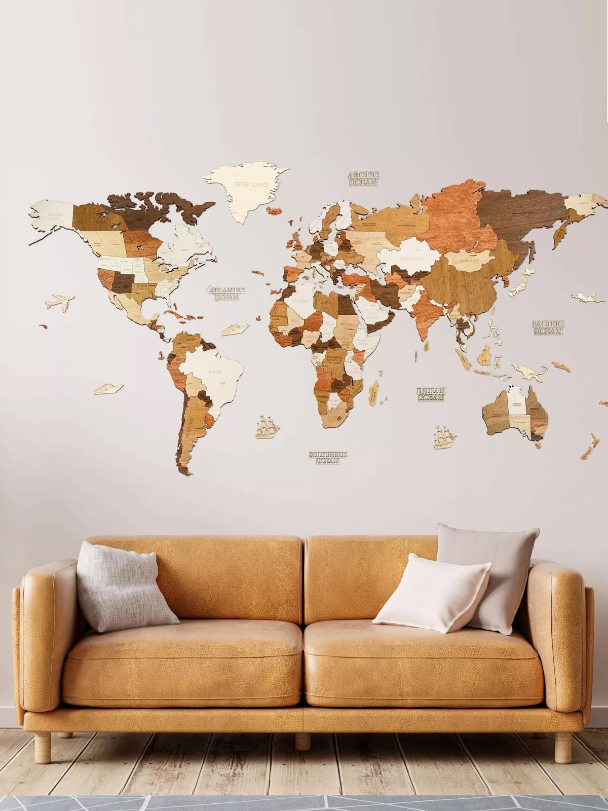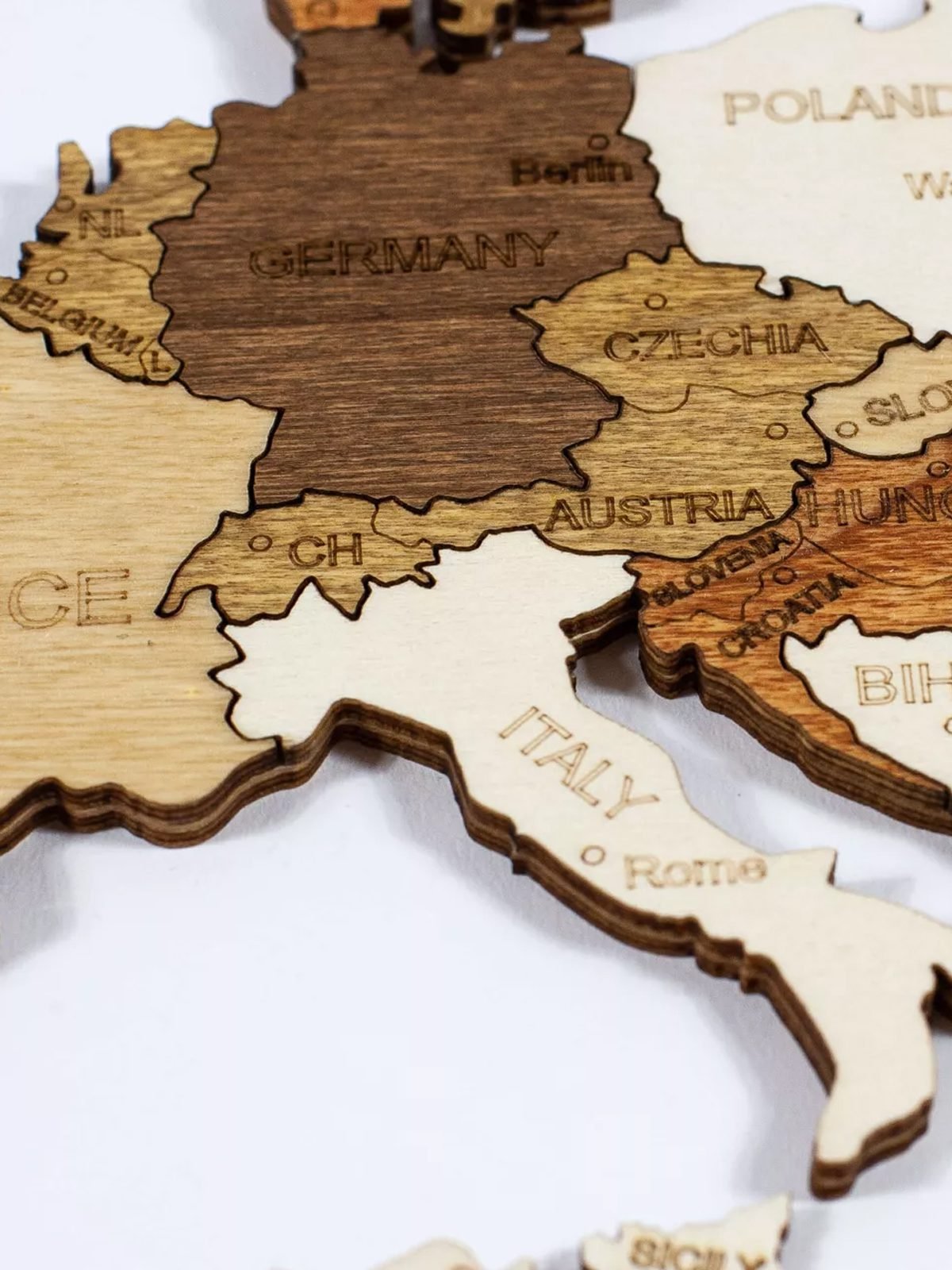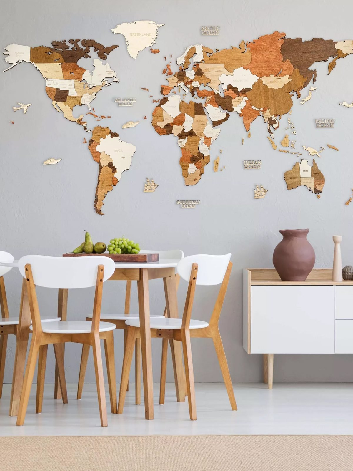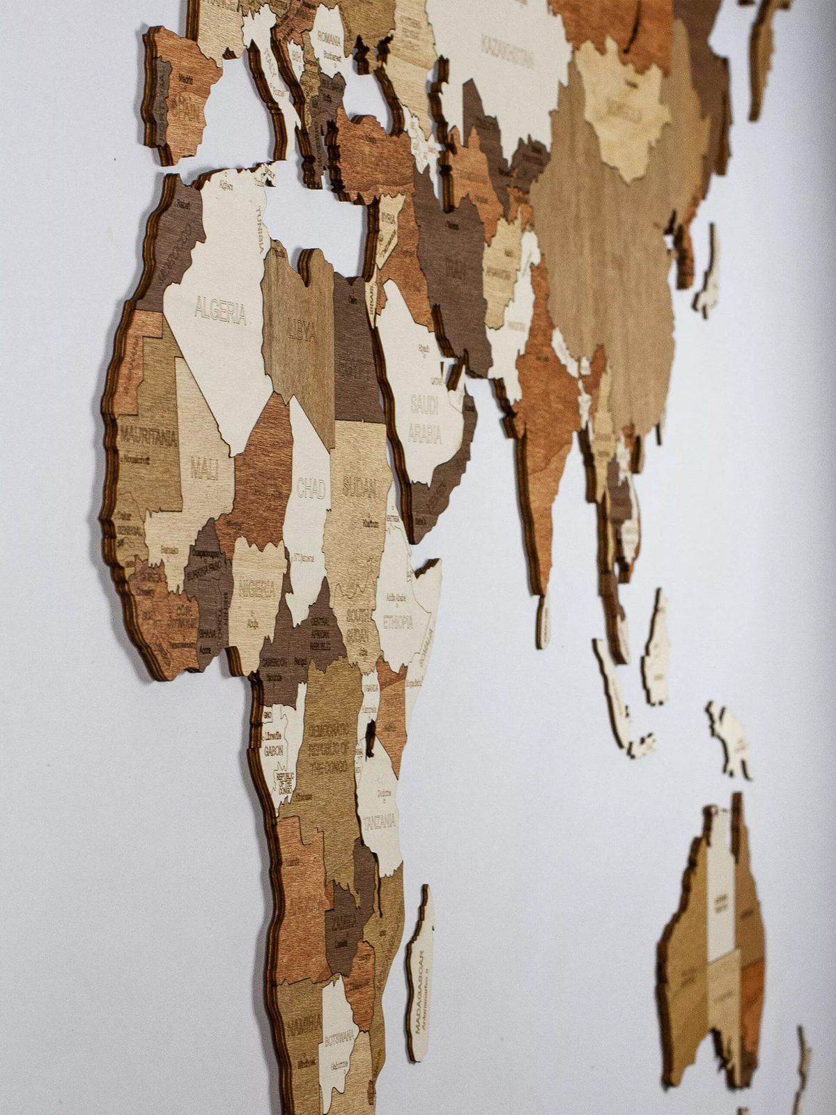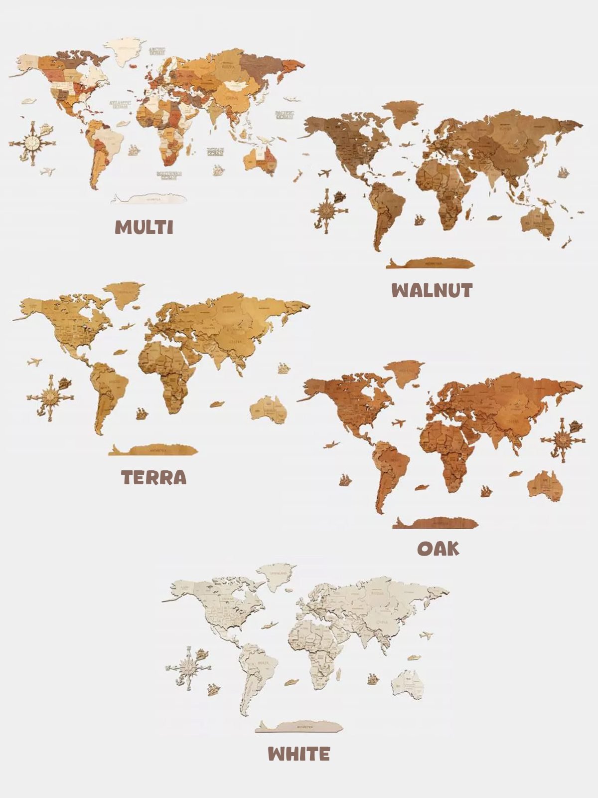 Denna 2D-världskarta, med Antarktis inkluderat, är helt skräddarsydd och tillverkad av naturligt trä, med en tjocklek som varierar från 3 till 7 mm. Detta är den icke-3D-versionen, så den har ett mer kompakt och renare visuellt uttryck. Kombinationen av skärning, gravyr och manuell betsning och limning skapar en originell och värdefull produkt. Våra världskartor i trä finns i olika storlekar och utföranden – alltid av högsta kvalitet. Varje karta innehåller också en steg-för-steg-manual, hörnstenciler, avtagbar monteringstejp och alla trätillbehör som океannamn, flygplan och en kompass. Dessutom erbjuder vi fri hemleverans.