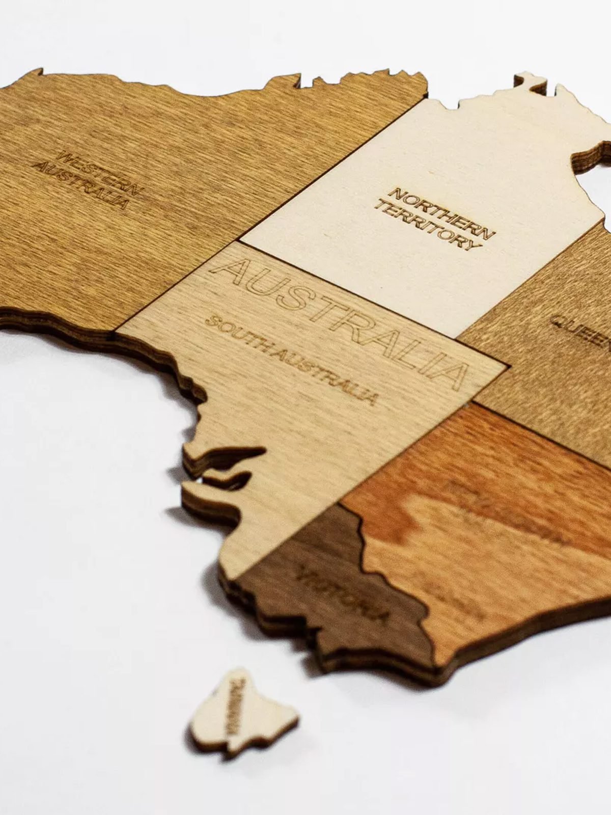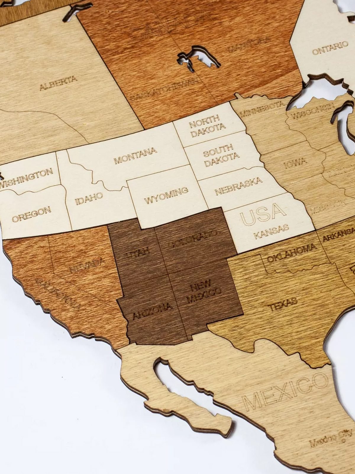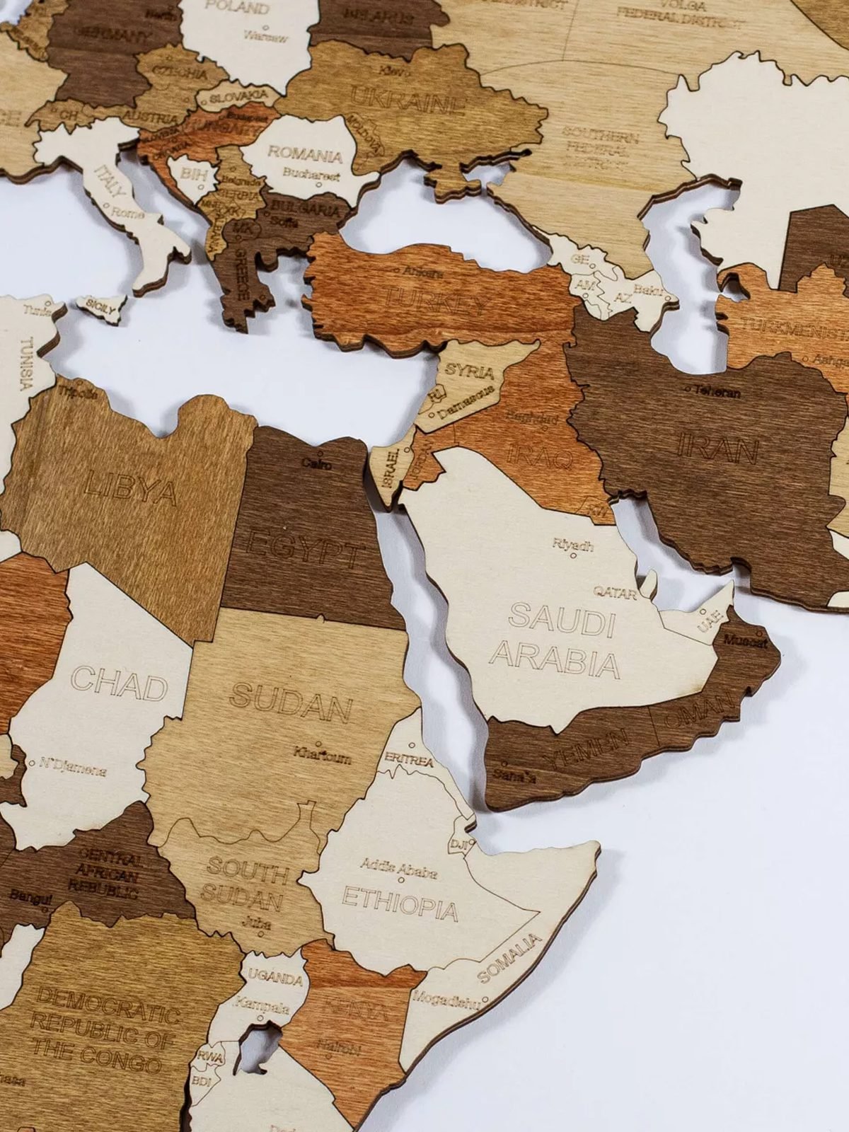 Observera: Kartan är dekorativ och inte en exakt geografisk representation; vissa mindre länder och öar kan vara utelämnade. Varje karta är unik i nyans och ådring på grund av det naturliga trämaterialet.