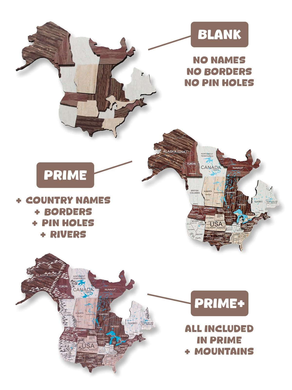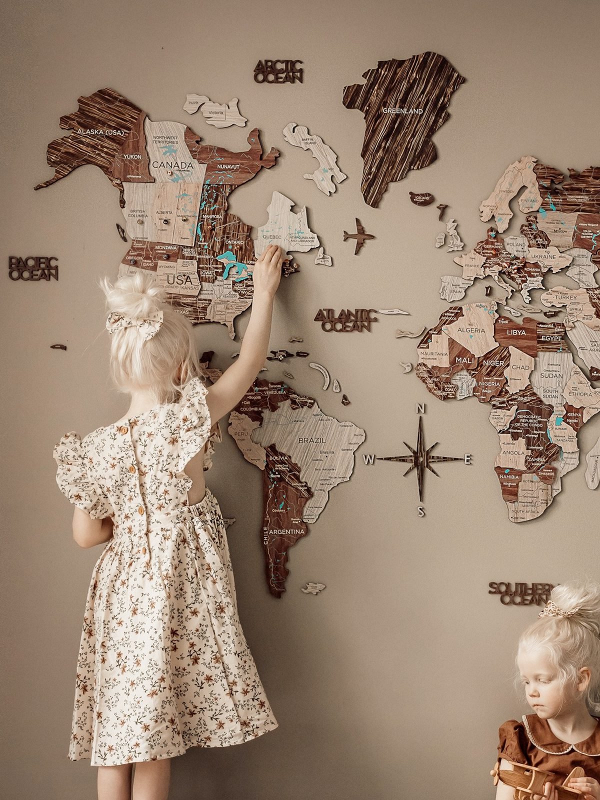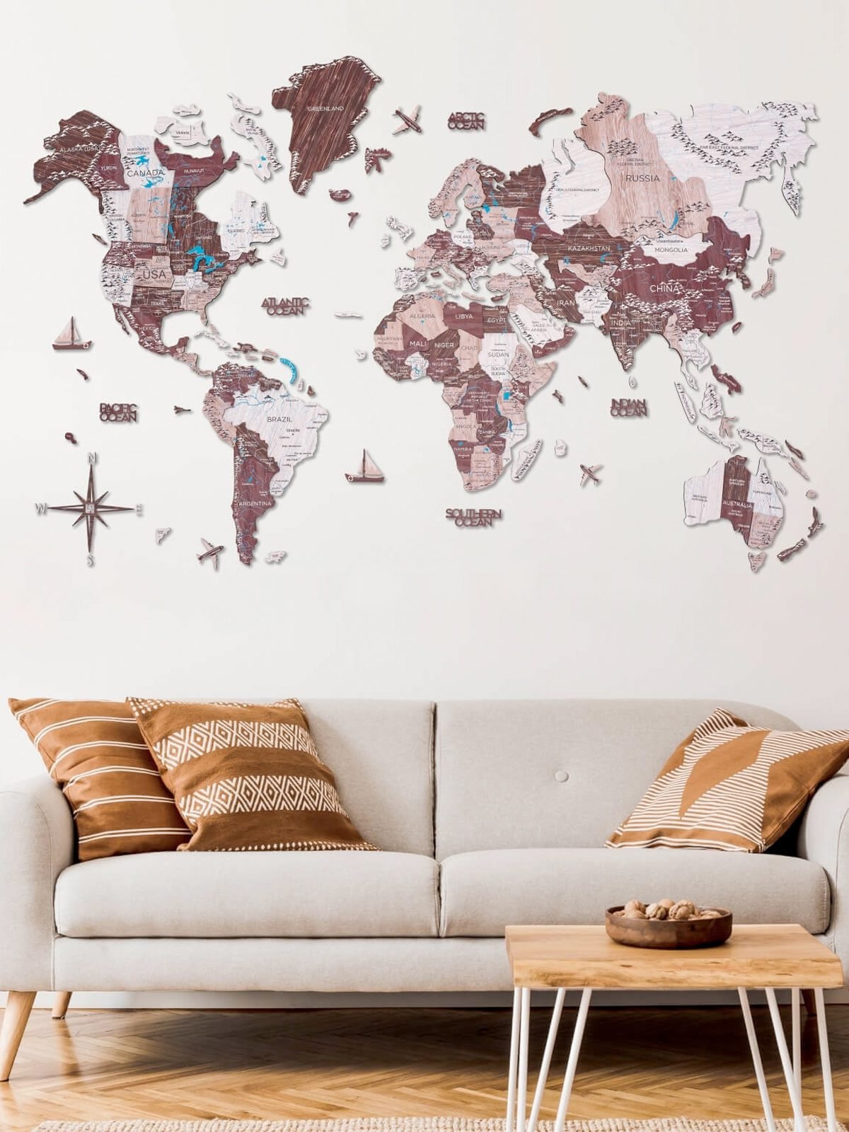 Denna världskarta är helt skräddarsydd och tillverkad av naturligt trä (6 mm till 18 mm tjock!). Våra världskartor i trä finns i olika storlekar och utföranden — alltid av högsta kvalitet. Varje karta innehåller även en steg-för-steg-manual, hörnmallar, avtagbar monteringstejp och alla träaccessoarer som oceannamn, flygplan och en kompass. Dessutom erbjuder vi gratis hemleverans.