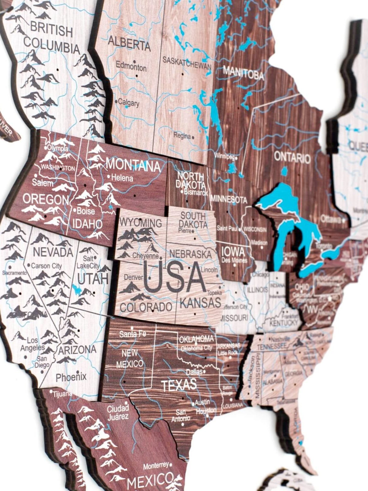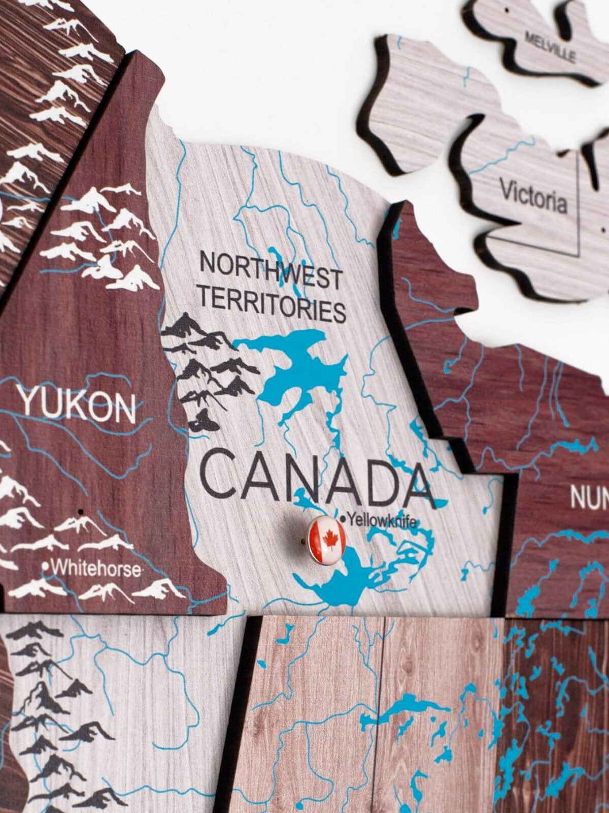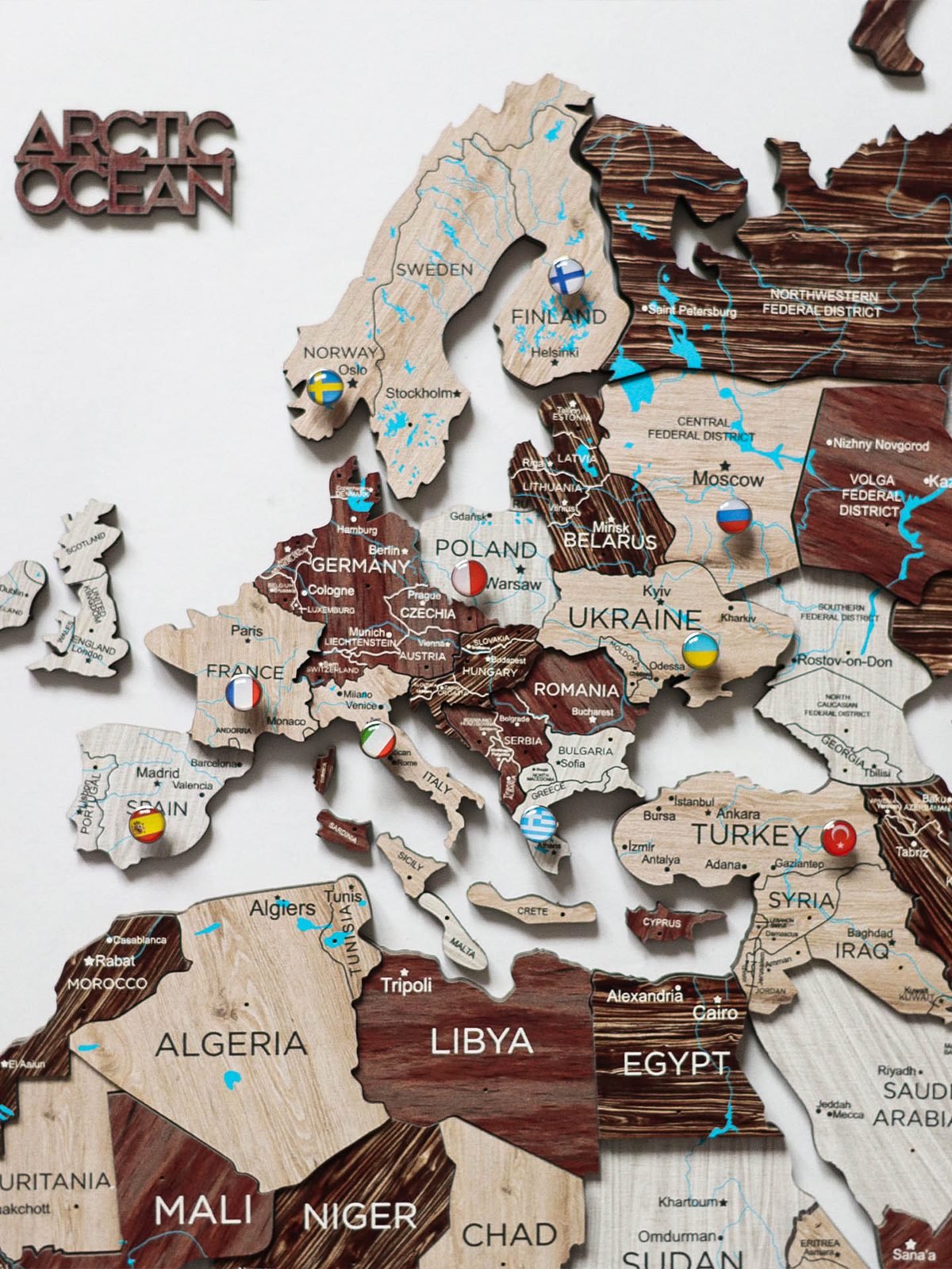 Observera: Kartan är dekorativ och inte en exakt geografisk representation; vissa mindre länder och öar kan vara utelämnade. Varje karta är unik i nyans och ådring på grund av det naturliga trämaterialet.
