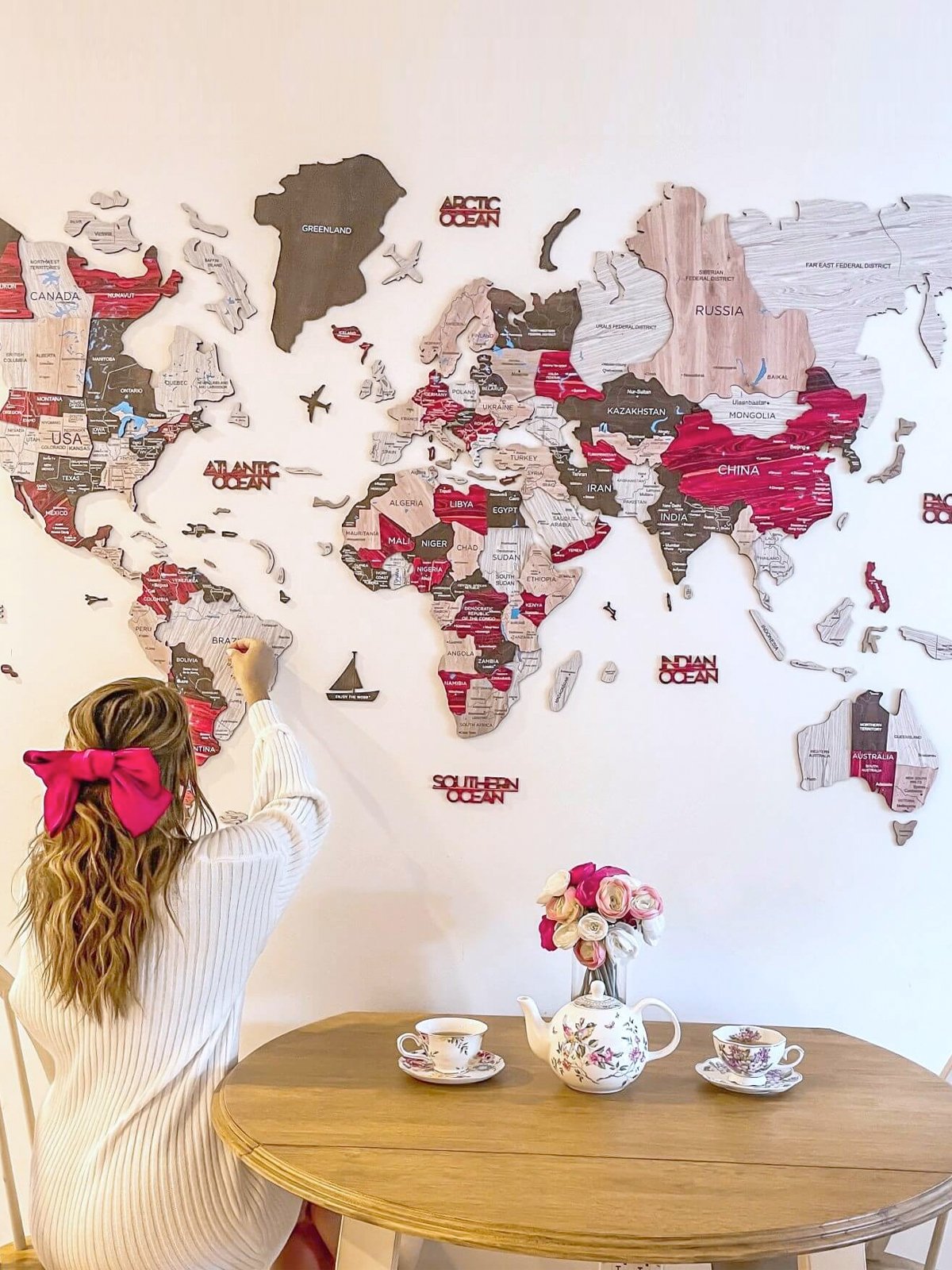 Denna världskarta är helt skräddarsydd och tillverkad av naturligt trä (6 mm till 18 mm tjock!). Våra världskartor i trä finns i olika storlekar och utföranden — alltid av högsta kvalitet. Varje karta innehåller även en steg-för-steg-manual, hörnmallar, avtagbar monteringstejp och alla träaccessoarer som oceannamn, flygplan och en kompass. Dessutom erbjuder vi gratis hemleverans.