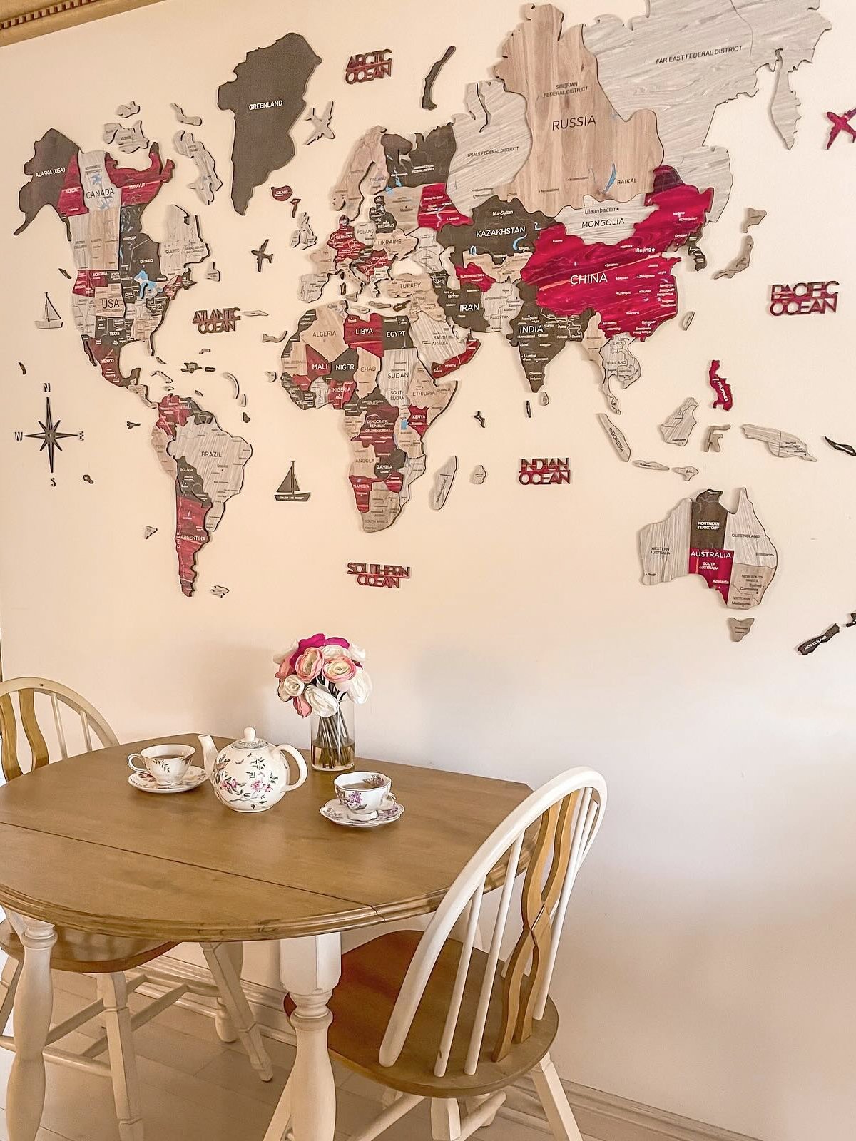 Observera: Kartan är dekorativ och inte en exakt geografisk representation; vissa mindre länder och öar kan vara utelämnade. Varje karta är unik i nyans och ådring på grund av det naturliga trämaterialet.