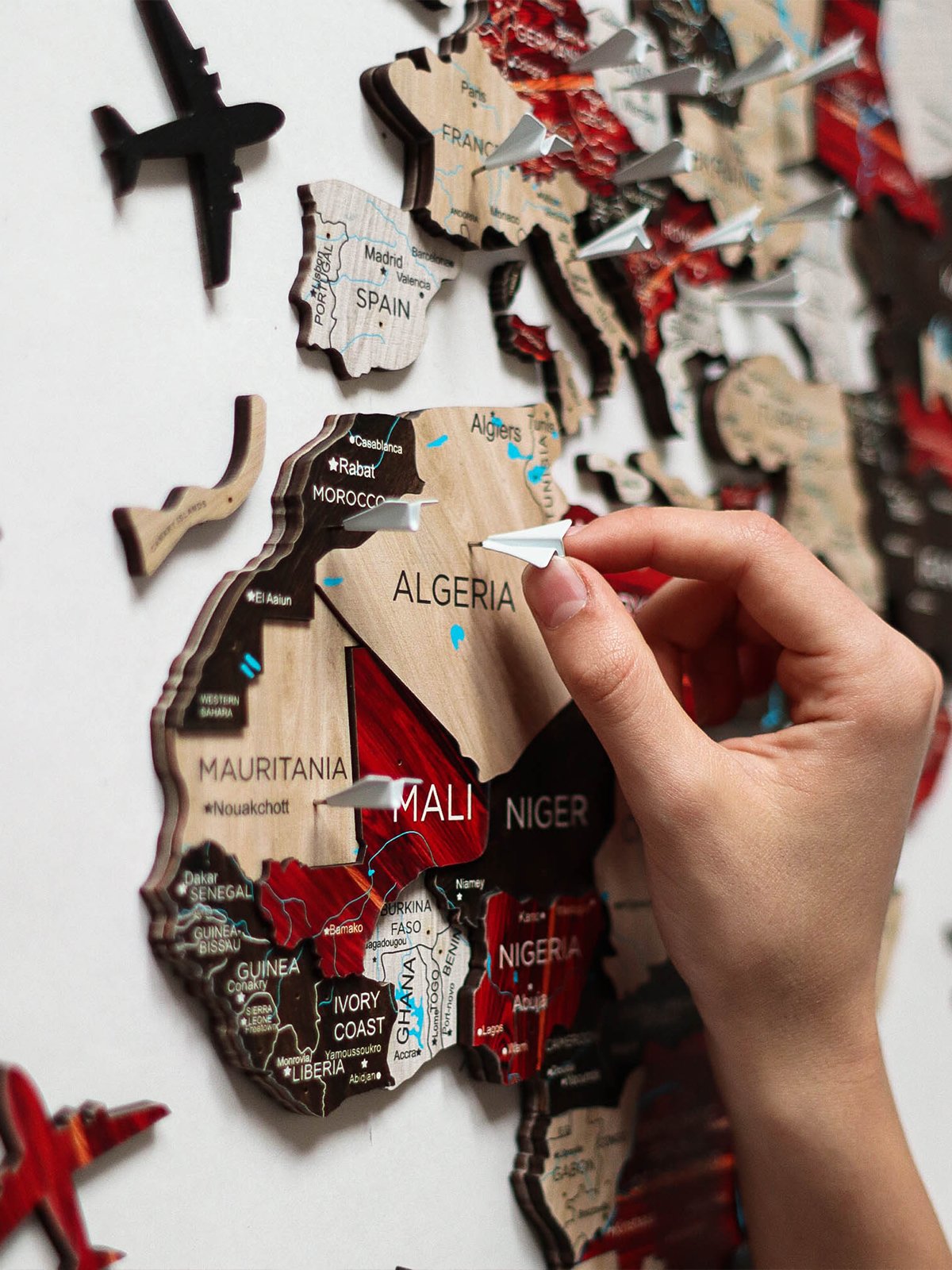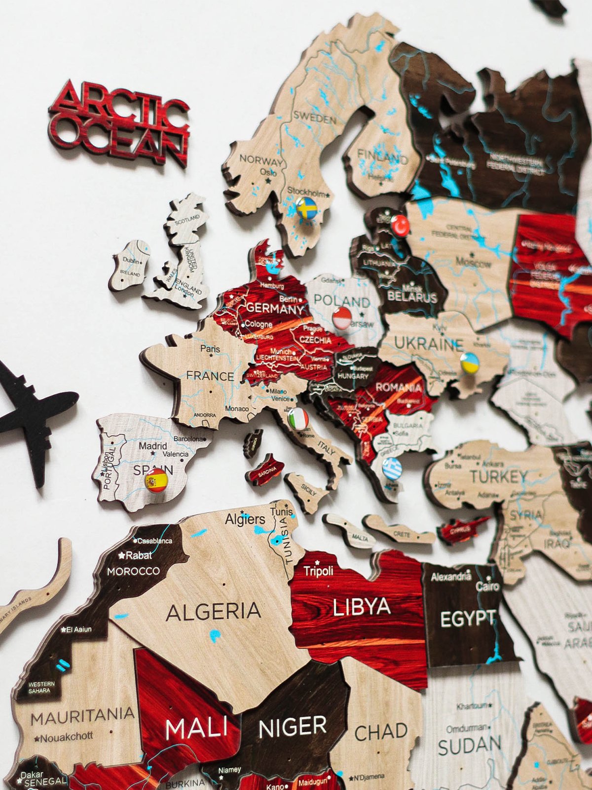 Upptäck våra vackra tillbehör för att göra din världskarta komplett. Lägg till stilrena flaggor och flygplan för att markera dina resor.